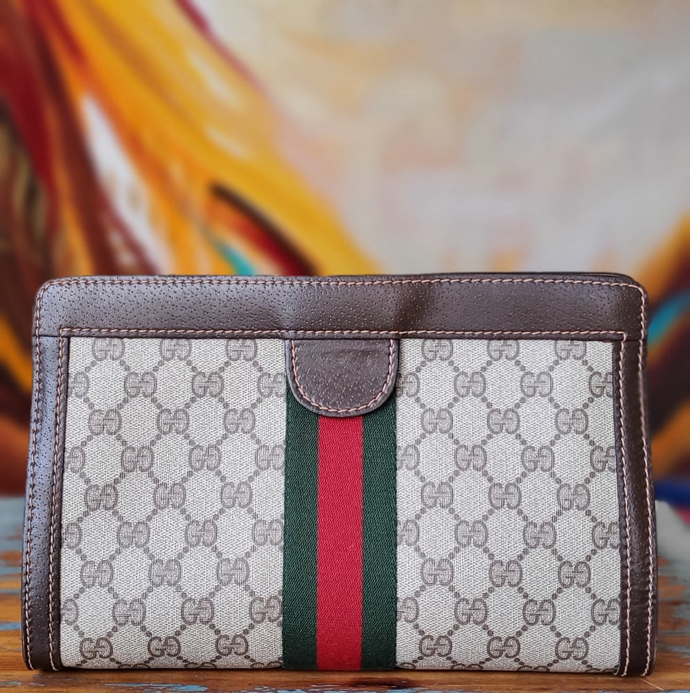 Vtg Gucci Brown Monogram Velcro Closure Clutch